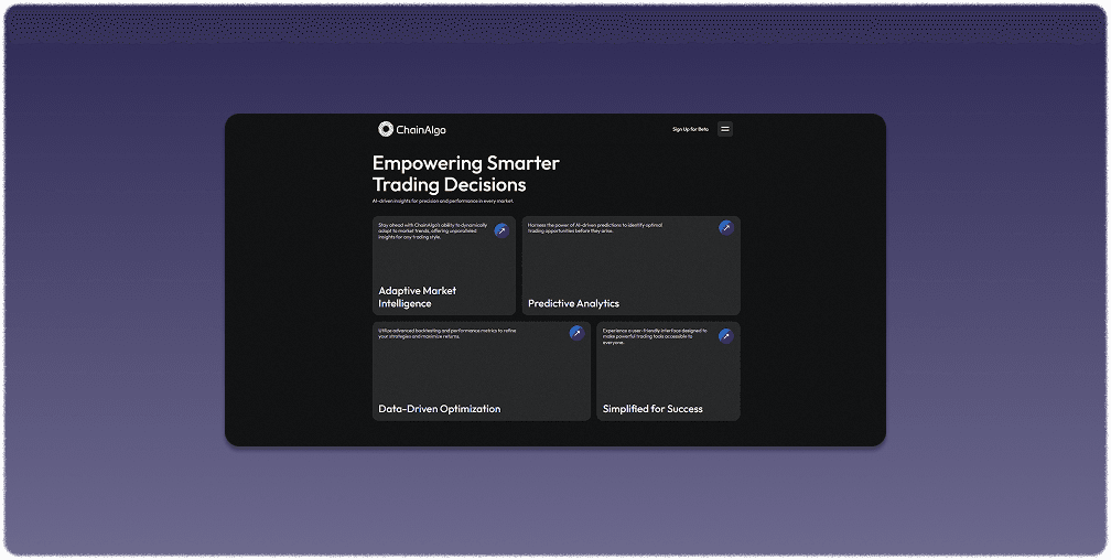 The algorithm was developed for use on TradingView, providing real-time Buy/Sell signals optimized for futures, forex, indices, and crypto markets. ChainAlgo’s landing page was crafted to convey trust, clarity, and performance, making it easy for traders or prop firms to understand the value and immediately take action.